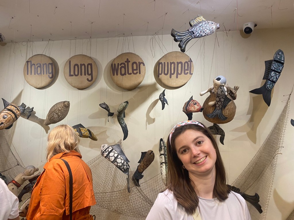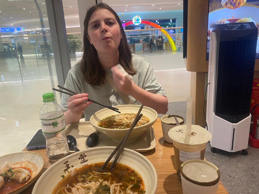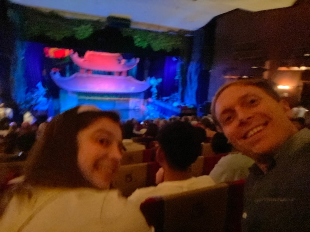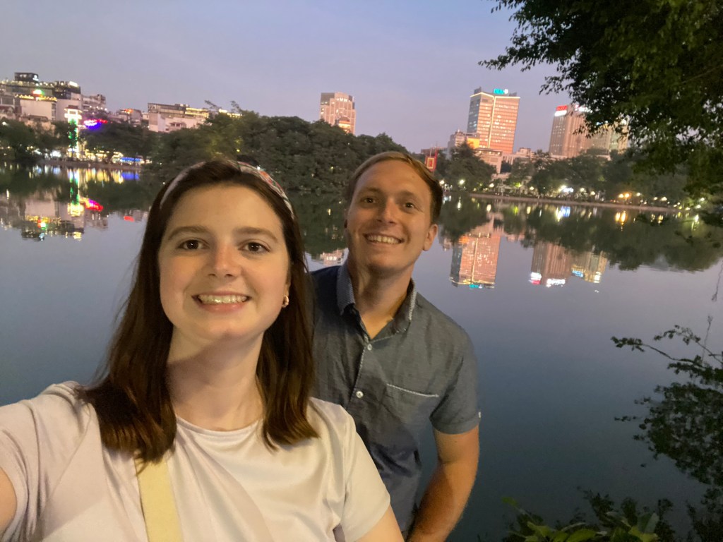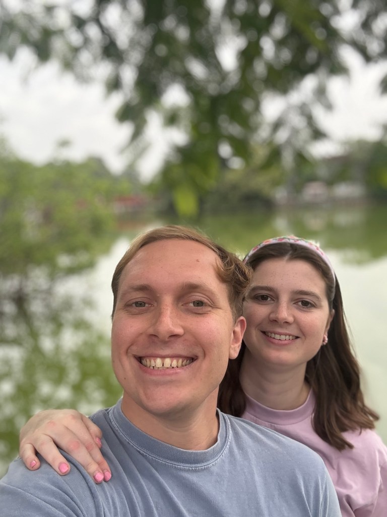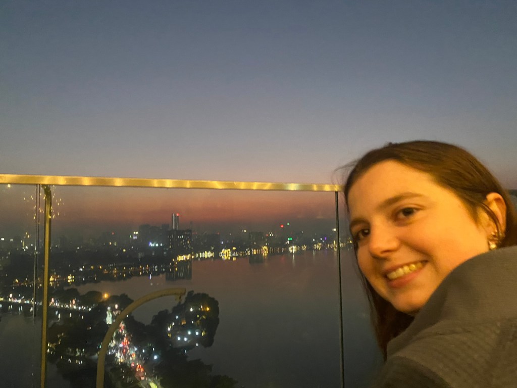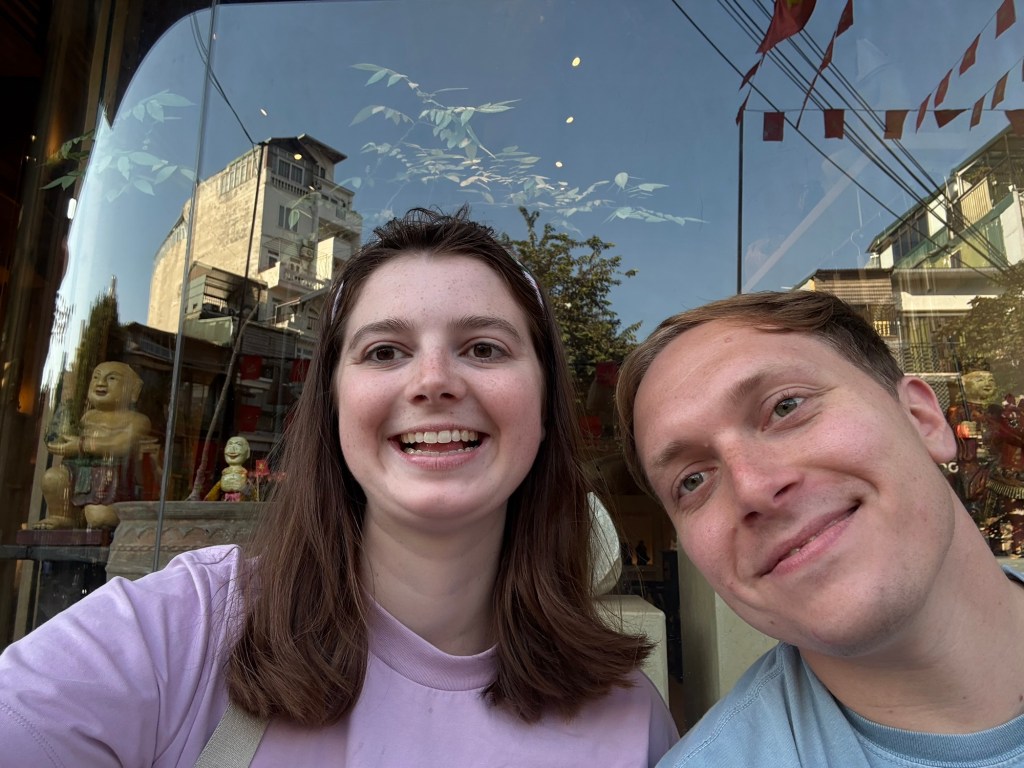 Bryson and I really liked the vibes of Hanoi. On our first day we wandered through the old quarter and around Hoan Kiem Lake, where the streets were closed off so families could hang out and kids could run wild. A bunch of children came up to us to practice their English, which we were happy to do. In the evening locals did Zumba classes, played badminton and danced on the pavements. It seemed like the whole city had come together to celebrate and socialise. That day was also the first time we tried Vietnamese pancakes, a dish that quickly became Bryson’s favourite. During our two weeks in Hanoi we continuously came back to the old town and lake, going on long walks, visiting shops and eating delicious food. We also visited Hanoi’s famous Train Street (we were eating bun cha when a train roared past just microns away from us) and the Temple of literature (where students pray for good grades). One evening we watched a traditional puppet show. I really enjoyed watching the puppets dance through water, but Bryson fell asleep within minutes. We also celebrated my birthday in Hanoi. Bryson took me to an incredible rooftop bar overlooking the whole city. It was literally the same view you see on google images when you search for Hanoi. Aside from exploring the city we spent a lot of time in our local mall (lotte west lake) and playing Skyrim (our new favourite game). If anything was truly terrifying in Hanoi, it was the roads. Traffic lights were completely ignored and crossing the road involved walking out into the swarm of traffic and hoping they would swerve past you. Being a taxi passenger was not much better as our drivers zigzagged all over the place. Thankfully our Airbnb provided some calm among the chaos. We had an amazing view of the city, which somehow even extended into the bathroom with no walls. Overall, we had a blast in Hanoi and definitely would go back.